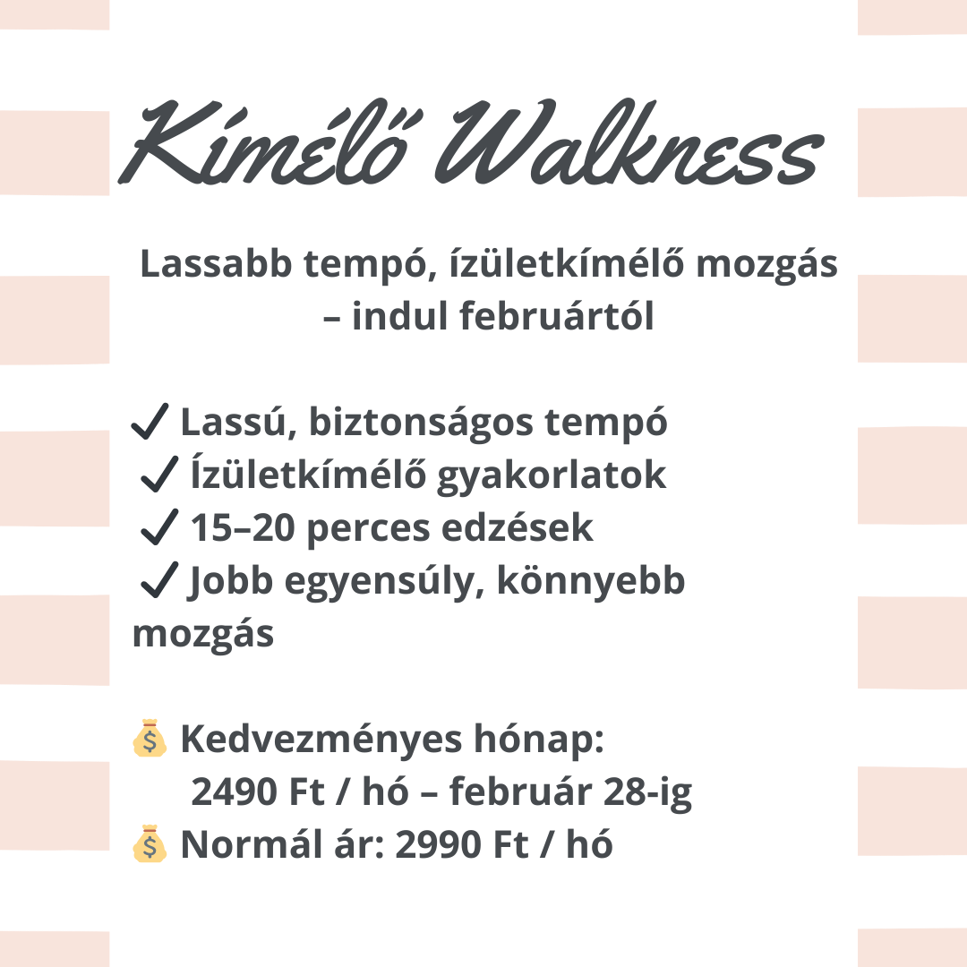 A Walkness kifejezést a walk és wellness szavakból alkottam meg. A célja, hogy a mozgás ne csak a testedet, hanem a lelkedet is feltöltse. Ez egy izületkímélő aerob mozgás, amelyet otthonod kényelméből, online végezhetsz. Nem kell hozzá semmilyen eszköz, és speciális öltözékre sincs szükség. Egyszerű, könnyen elsajátítható mozdulatokkal dolgozunk, hatékonyan megmozgatva az egész testet.